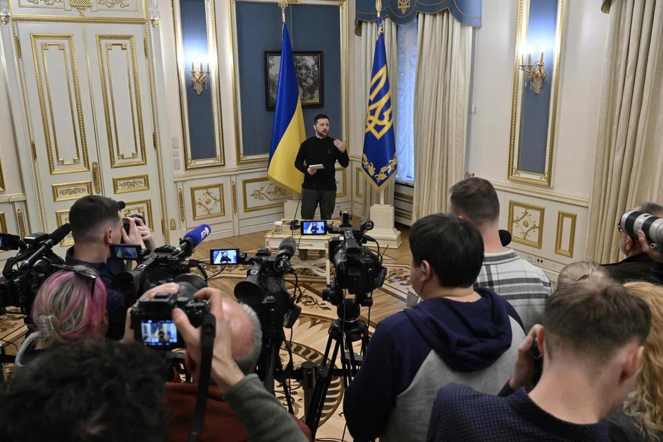 கியவ் நகரில் செய்தியாளர் கூட்டத்தில் உக்ரேனிய அதிபர் வெலோடிமிர் ஸெலென்ஸ்கி உரையாற்றினார். - படம்: ஏஎஃப்பி
