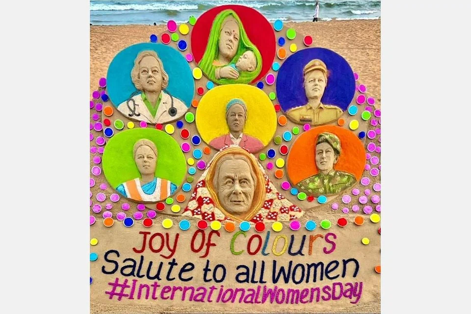அனைத்துலக மகளிர் தினத்தை முன்னிட்டு இந்தியாவில் மணல் சிற்ப கலைஞர் சுதர்சன் பட்நாயக் பெண்களுக்காக வண்ணமயமான மணல் சிற்பத்தை செய்து அசத்தியுள்ளார்.