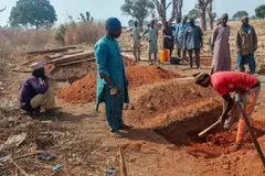 வோரோ சமூகத்தில் பயங்கரவாதத் தாக்குதலில் பலியானவர்களின் உடல்களை அடக்கம் செய்வதற்கு முன்பு, மக்கள் பிரார்த்தனை செய்கிறார்கள். - படம்: ராய்ட்டர்ஸ்