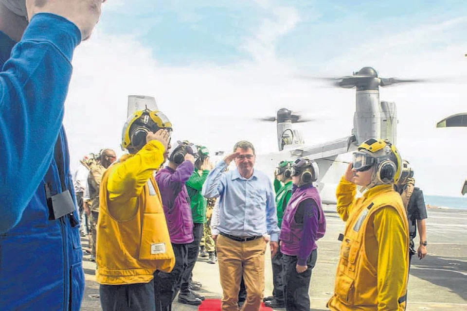 அமெரிக்க தற்காப்பு அமைச்சர் ஆஷ்டன் கார்ட்டர் தென்சீனக் கடல் பகுதிக்கு வந்தபோது அமெரிக்க கடற்படை வீரர்கள் ராணுவ மரியாதையுடன் அவரை வரவேற்றனர். படம்: ராய்ட்டர்ஸ்