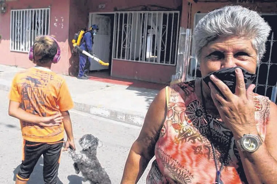 கொலம்பியாவின் காலி நகரில் சுகாதார ஊழியர்கள் கிருமி நாசினியைத் தெளிக்கையில் குடியிருப்பார்கள் வீட்டுக்கு வெளியே காத்திருக்கின்றனர். படம்: ஏஎஃப்பி