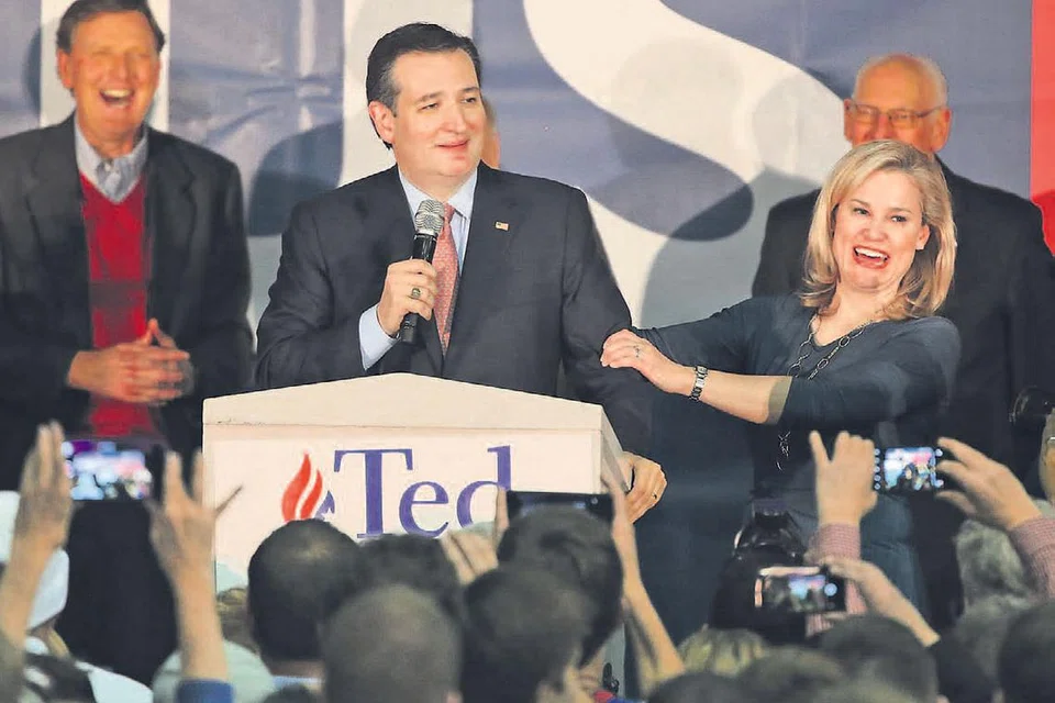 அயோவா மாநில வாக்களிப்பில் வெற்றி பெற்ற குடியரசுக் கட்சி வேட்பாளர் டெட் குருஸ் (நடுவில்) ஆதரவாளர்கள் முன்பு உரையாற்றுகிறார். அவருக்குப் பக்கத்தில் அவரது மனைவி ஹெய்டி. படம்: ஏஎஃப்பி
