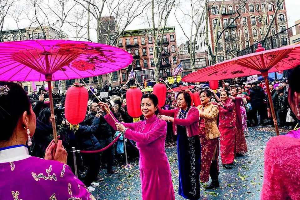 நியூயார்க்கில் இருக்கும் சைனா டவுன் வட்டாரத்தின் சாரா ரூஸ்வெல்ட் பூங்காவில் தென் சீனத்தின் பாரம்பரிய உடை அணிந்த பெண்கள் சீனப் புத்தாண்டுக் கொண்டாட் டத்தில் நடனமாடினர். படம்: ஏஎஃப்பி