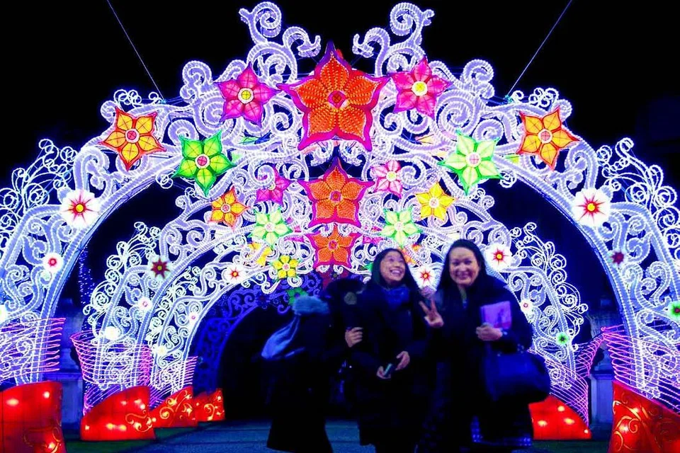 பிரிட்டன் தலைநகரான லண்டனின் சிஸ்விக் ஹவுஸ் கார்டன்ஸில் சீனப் புத்தாண்டு கொண்டாட்டத்தின் ஒருபகுதியாக மாய லாந்தர் விழா என்ற கருப் பொருளில் உருவாக்கப் பட்ட அலங்கார வளைவு பலரையும் ஈர்த்தது. படம்: ராய்ட்டர்ஸ்