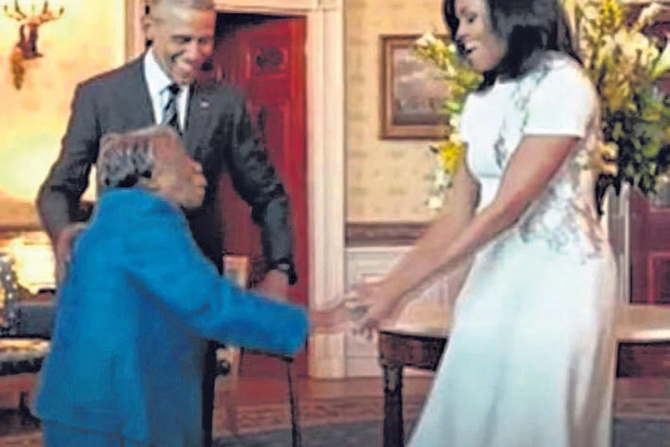 'அமெரிக்காவின் முதல் கறுப்பின அதிபரைச் சந்தித்து விட்டேன்' எனக்கூறி உற்சாக மடைந்த அந்த மூதாட்டி திரு ஒபாமா மற்றும் அவரது மனைவி மிஷெலின் கைகளை பிடித்துக்கொண்டு நடனம் ஆடினார். அந்த மூதாட்டியை மேலும் உற்சாகப்படுத்த திரு ஒபாமாவும் அவரது மனைவியும் மூதாட்டியின் கைகளைப் பிடித்துக்கொண்டு நடனம் ஆடியிருக்கின்றனர். அமெரிக்காவை வடிவமைத்த ஆப்பிரிக்க அமெரிக்கர்களுக்கு பாராட்டுத் தெரிவிக்கும் வகையில் பிப்ரவரி மாதம், கறுப்பின வரலாற்று மாதமாக அமெரிக்காவில் கடைப்பிடிக் கப்படுகிறது. இதையொட்டி அந்த மூதாட்டி ஒபாமாவை வெள்ளை மாளிகையில் சந்தித்தார். "திரு ஒபாமாவை சந்திப்பேன் என்று நான் நினைத்துக்கூடப் பார்க்கவில்லை" என்று கூறிய அந்த மூதாட்டி தன் வாழ்நாள் கனவு நிறைவேறிவிட்ட தாகக் கூறினார்.