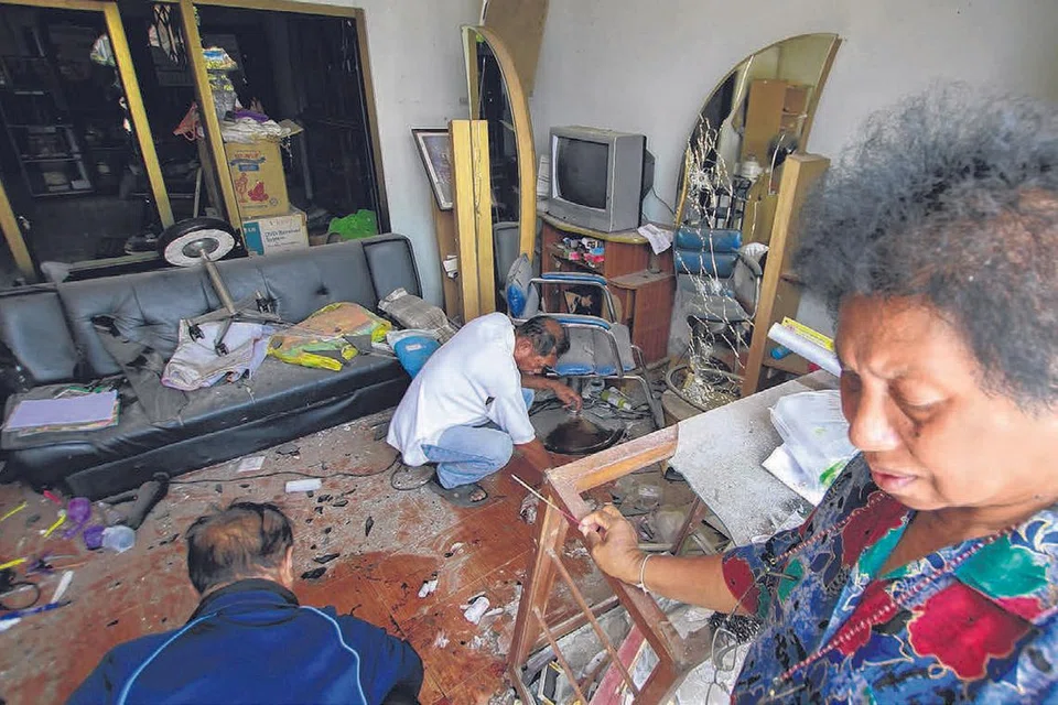 தென்தாய்லாந்தில் முடிதிருத்தும் கடைக்கு அருகே குண்டு வெடித்தில் உயிரிழந்த ஒரு ஆடவரின் உறவினர்கள் அந்தக் கடையை சுத்தப்படுத்துகின்றனர். படம்: ராய்ட்டர்ஸ்