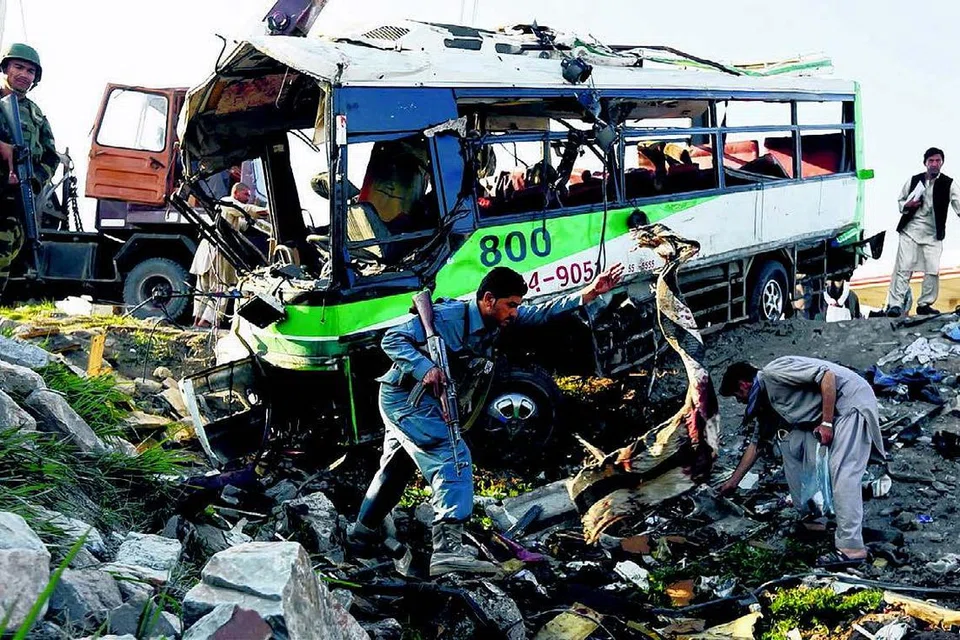 இராணுவத்தினர் சென்ற பேருந்து மீது நடத்தப்பட்ட தற்கொலைப்படை தாக்குதலில் சேதமடைந்த வாகனத்தின் சிதைவுகளைப் பார்வையிடும் போலிசார். படம்: ராய்ட்டர்ஸ்