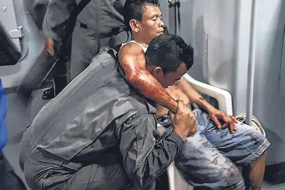 மலேசியாவின் சாபா கிழக்கு கடலோரப் பகுதியில் கடத்தல்காரர்கள் துப்பாக்கியால் சுட்டதில் காயமுற்ற இந்தோனீசிய சிப்பந்தி ஒருவரை மலேசிய கடல் துறை அமலாக்கப் படையினர் காப்பாற்றுகின்றனர். படம்: ஏஎஃப்பி