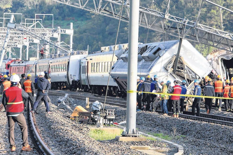 தடம் புரண்ட ரயில் பெட்டிகளை மீண்டும் தண்டவாளத்திற்கு கொண்டுவரும் பணியில் ரயில்வே ஊழியர்கள் ஈடுபட்டுள்ளனர். படம்: ஏஎஃப்பி