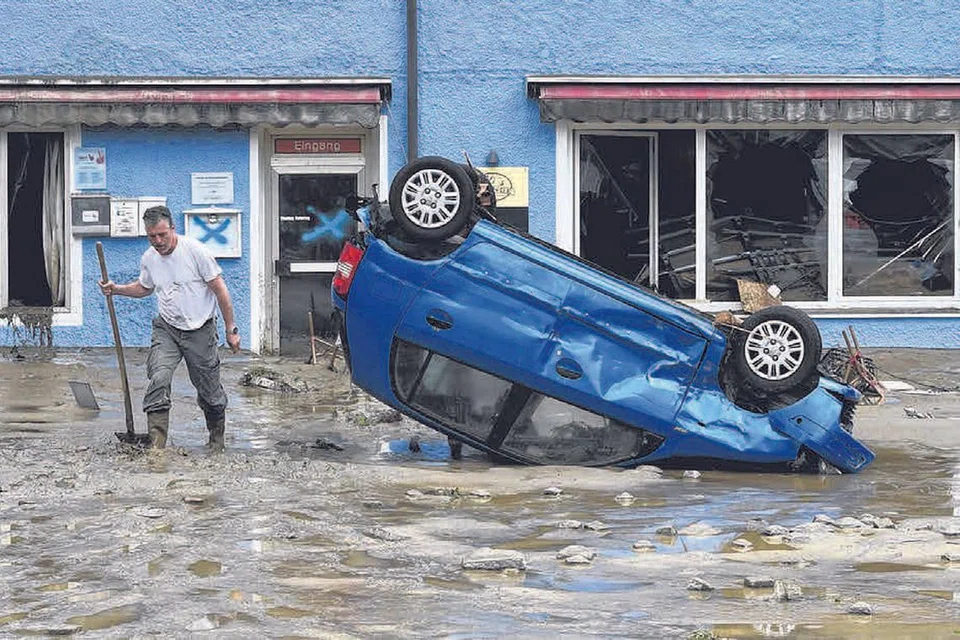 தெற்கு ஜெர்மனியில் பெய்த கனமழையைத் தொடர்ந்து குடியிருப்புப் பகுதியில் வெள்ளநீர் தேங்கியுள்ளது. வெள்ளத்தில் சேதமடைந்த ஒரு காருக்குப் பக்கத்தில் குடியிருப்பாளர் ஒருவர் நடந்து செல்கிறார். படம்: ஏஎஃப்பி