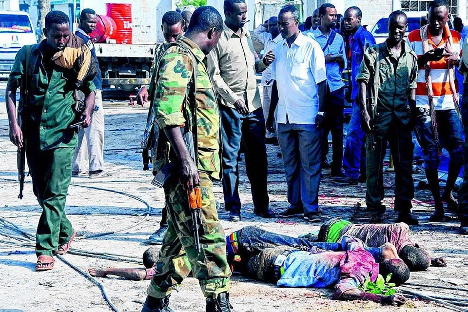 தாக்குதலில் மாண்டவர்களைப் பார்வையிடும் சோமாலிய ராணுவ வீரர்கள். 15 பேர் மரணமடைந்ததுடன் ஏறத்தாழ 20 பேர் காயமுற்றனர். படம்: ஏஎஃப்பி