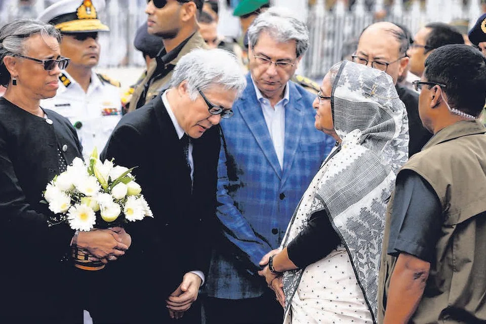 டாக்காவில் உள்ள உணவகத்தில் நடத்தப்பட்ட துப்பாக்கிச்சூட்டில் கொல்லப்பட்ட 20 பேருக்கு அஞ்சலி செலுத்தும் நிகழ்ச்சியில் கலந்துகொண்ட பங்ளாதேஷ் பிரதமர் ஹசீனா (புடவையில்) பங்ளாதேஷுக்கான ஜப்பான் தூதர் வட்னாபியுடன் உரையாடினார். படம்: ராய்ட்டர்ஸ்