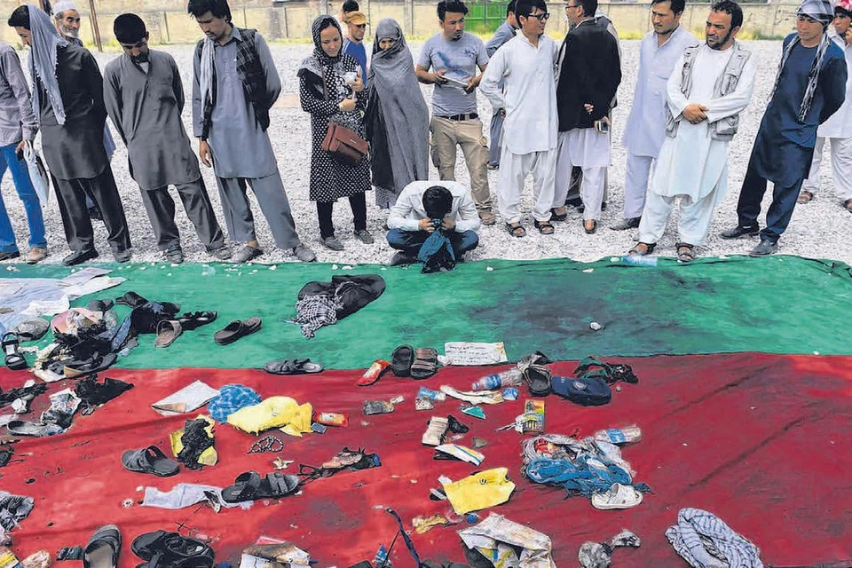 காபூல் தாக்குதலில் கொல்லப்பட்டவர்களின் காலணிகளும் உடைமைகளும் காணப்படும் இடத்தில் உறவினர் ஒருவர் கதறி அழுகிறார். ஏராளமானோர் அந்த இடத்தில் கூடியுள்ளனர். படம்: ஏஎஃப்பி