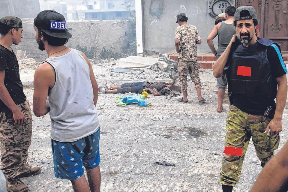 லிபியாவில் முன்னாள்அதிபர் கடாஃபியின் வீழ்ச்சிக்குப் பின் பல போராளிக் குழுக்கள் உருவாகியுள்ளன. போதாக் குறைக்கு மத்திய கிழக்கின் பல பகுதிகளில் உள்ள ஐஎஸ் பயங்கரவாதக் குழுவினர் தொடர்ந்து பல நாடுகளின் பாதுகாப்புப் படையினருக்கு சவாலாக விளங்கி வருகின்றனர். படத்தில் லிபியாவின் ஐநா அங்கீகாரம் பெற்ற அரசாங்கப் படையினர் சுட்டுக் கொல்லப்பட்ட ஐஎஸ் பயங்கரவாத அமைப்பைச் சேர்ந்த ஒருவரைப் பார்க்கின்றனர். படம்: ராய்ட்டர்ஸ்