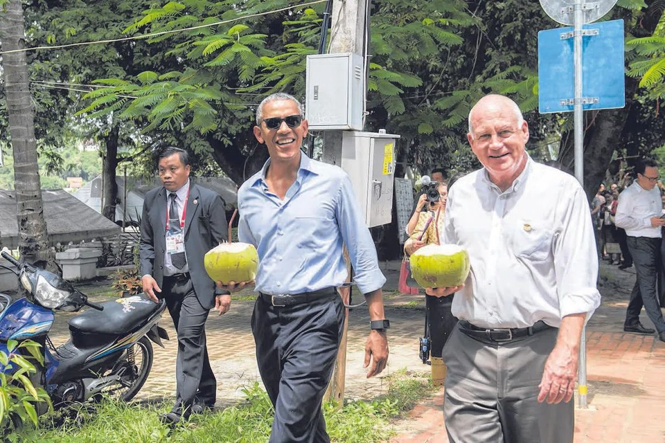 அமெரிக்க அதிபர் ஒபாமா, லாவோஸ் பயணத்தின்போது மீகோங் ஆற்றங்கரை ஓரமாக லுவாங் பிரபாங் எனுமிடத்தில் லாவோஸ் நாட்டுக்கான அமெரிக்கத் தூதர் டேனியல் குலுனி என்பவருடன் இளநீர் அருந்துகிறார். முன்னதாக லாவோசில் நடந்த ஆசியான் மாநாட்டில் உரையாற்றிய திரு ஒபாமா, வியட்னாம் போரின்போது லாவோஸ் நாட்டில் போடப்பட்ட குண்டுகளை அகற்ற அந்நாட்டுக்கு உதவி செய்வதாக உறுதி அளித்துள்ளார்.