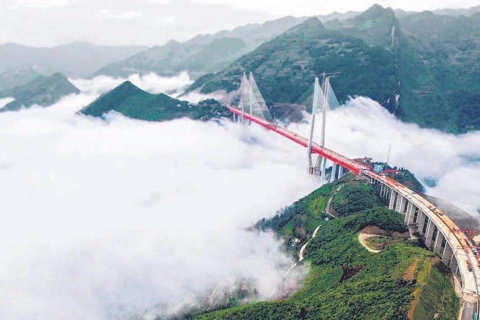 சீனாவில் அமைக்கப்பட்டுள்ள உலகின் மிக உயரமான மேம்பாலம் மலைகளுக்கு இடையே இரண்டு மாகாணங்களை இணைக்கிறது. இது, இவ்வாண்டு இறுதியில் திறக்கப்படவிருக்கிறது. படம்: ராய்ட்டர்ஸ்