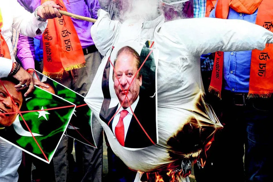 இந்தியாவின் உரி ராணுவ முகாமில் நடத்தப்பட்ட தாக்குதலைக் கண்டித்து பாகிஸ்தான் பிரதமர் நவாஸ் ஷெரிப்பின் உருவ பொம்மையை எரிக்கும் இந்திய அரசியல் கட்சியினர். படம்: ஏஎஃப்பி