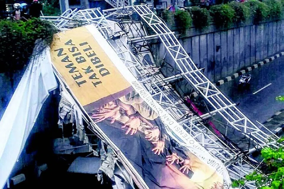 ஜகார்த்தா தென் பகுதியில் உள்ள ஒரு பாலம் சரிந்து விழுந்ததைத் தொடர்ந்து தீயணைப்பாளர்களும் மீட்புக் குழுவினரும் அவ்விடத்திற்கு விரைந்து சென்றனர். இந்தப் பாலம் ரயில் நிலையத்துடன் இணைக்கப்பட்டிருப்பதால் அந்த ரயில் நிலையத்திற்குச் செல்ல பலர் இந்தப் பாலத்தை பயன்படுத்தி வந்தனர். படம்: ஜகார்த்தா போலிஸ்