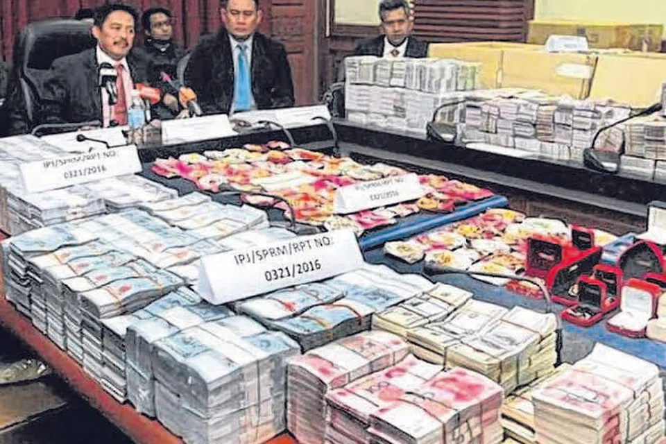 கைப்பற்றப்பட்ட பல மில்லியன் ரொக்கம், நகைகள், சொத்துப் பத்திரங்களை மலேசிய ஊழல் தடுப்பு ஆணையத்தின் அதிகாரிகள் பார்வைக்கு வைத்துள்ளனர். படம்: த ஸ்டார்