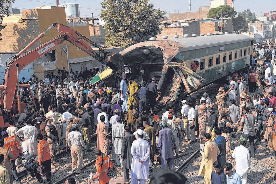 கராச்சி நகரில் ஜகாரியா எக்ஸ்பிரஸ் ரயிலும் ஃபாரீத் எக்ஸ்பிரஸ் ரயிலும் நேருக்கு நேர் மோதிக்கொண்ட இடத்தில் மீட்புப் பணிகள் நடந்து வரும் நிலையில் ஏராளமானோர் அங்கு கூடியுள்ளனர். படம்: ஏஎஃப்பி