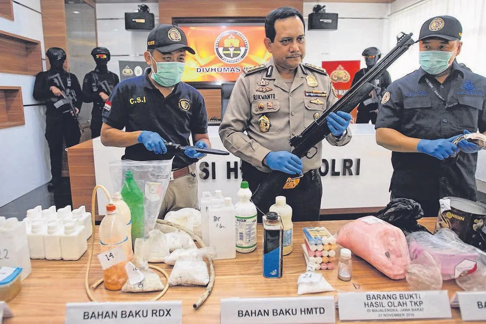 இந்தோனீசியாவின் ஜகார்த்தாவில் கைதுசெய்யப்பட்ட தீவிரவாதி ஒருவரிடம் இருந்து கைப்பற்றப்பட்ட ஆயுதங்கள், வெடிகுண்டு தயாரிக்கப் பயன்படும் கருவிகள் போன்றவை பற்றி போலிசார் ஊடகத்தினருக்கு விளக்குகின்றனர். படம்: அந்தாரா ஃபோட்டோ.