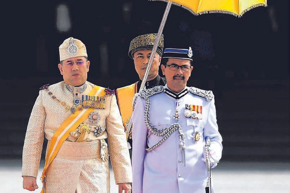 நாடாளுமன்ற சதுக்கத்தில் நடந்த வரவேற்பு நிகழ்ச்சியில் சுல்தான் முகம்மது (இடது) ராணுவ மரியாதை அணிவகுப்பை பார்வையிட்டார். படம்: ஏஎஃப்பி