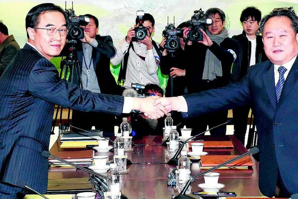 தென்கொரிய ஒருங்கிணைப்பு அமைச்சர் சோ முயுங் குயுன் (இடது) வடகொரிய பேராளர் குழுத் தலைவர் ரி சோன் - குவோன் ஆகிய இருவரும் நேசக்கரம் நீட்டி பேச்சுவார்த்தையைத் தொடங்கினர். படம்: ஏஎஃப்பி