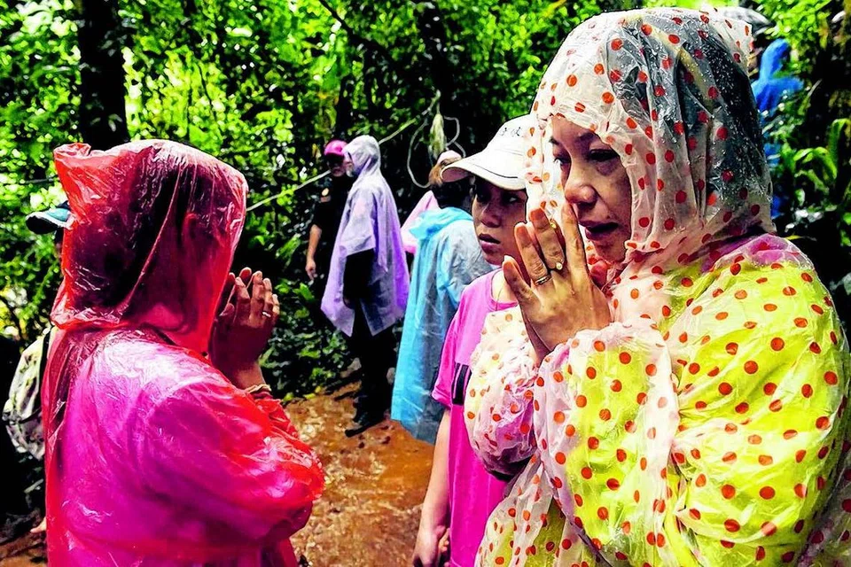குகைக்குள் சிக்கிக்கொண்டவர்கள் பாதுகாப்பாக வெளியில் வர உறவினர்கள் பிரார்த்தனை செய்கின்றனர். குகையை சுற்றிப்பார்க்க சென்ற காற்பந்துக் குழுவினரை காணாததையடுத்து போலிசார், ராணுவம் உட்பட பலர் தேடும் பணியில் ஈடுபட்டுள்ளனர். படம்: ஏஎஃப்பி