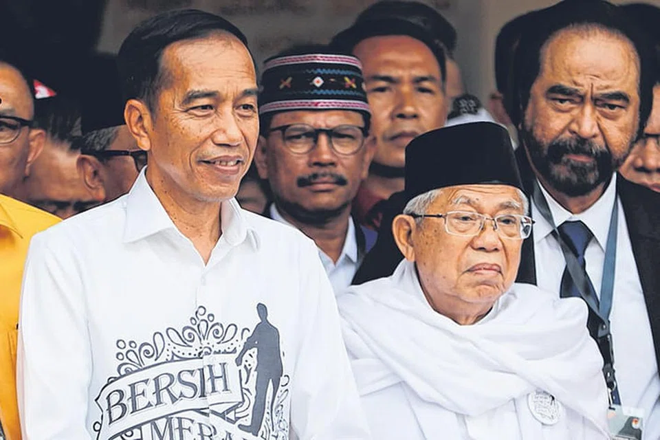 இந்தோனீசிய அதிபர் விடோடோவும் துணை அதிபர் வேட்பாளர் இஸ்லாமிய சமய குரு மருஃப் அமினும் ஆதரவாளர்களைச் சந்தித் தனர். படம்: ராய்ட்டர்ஸ்