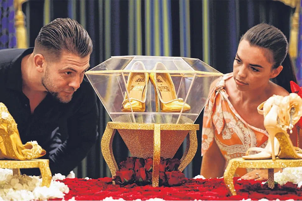 துபாயில் உள்ள 'புர்ஜ் அல் அராப்' ஹோட்டலில் உலகின் ஆக விலை உயர்ந்த காலணிகள் காட்சிக்கு வைக்கப்பட்டுள்ளன. இந்தக் காலணிகளின் மதிப்பு $17,000. இந்தக் காலணிகளில் நூற்றுக்கணக்கான வைரக்கற்கள் பதிக்கப் பட்டுள்ளன. அவற்றில் 'டி ஃப்ளோலஸ்' நிறுவனம் தயாரித்துள்ள இரண்டு 15 கராட் வைரக்கற்களும் அடங்கும் என்று துபாயின் 'கலீஜ் டைம்ஸ்' நாளிதழ் தெரிவித்தது. இந்தக் காலணிகளைத் தயாரிக்க ஒன்பது மாதங்கள் பிடித்ததாகக் கூறப்படுகிறது. படம்: ராய்ட்டர்ஸ்