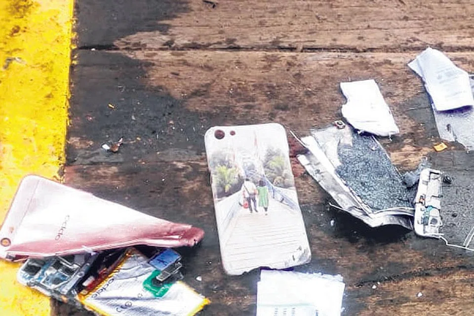 ஒரு பயணியின் பையிலிருந்த பொருட்கள். (கீழ் இடது) மீட்புப் பணி ஊழியர்கள் கடலிலிருந்து மீட்கப்பட்ட பயணியின் உடைமைகளை அடையாளம் காண்கின்றனர். (கீழ் வலது) கடலில் காணப்பட்ட ஒரு பயணியின் பணப்பை. படம்: ராய்ட்டர்ஸ், ஏஎஃப்பி