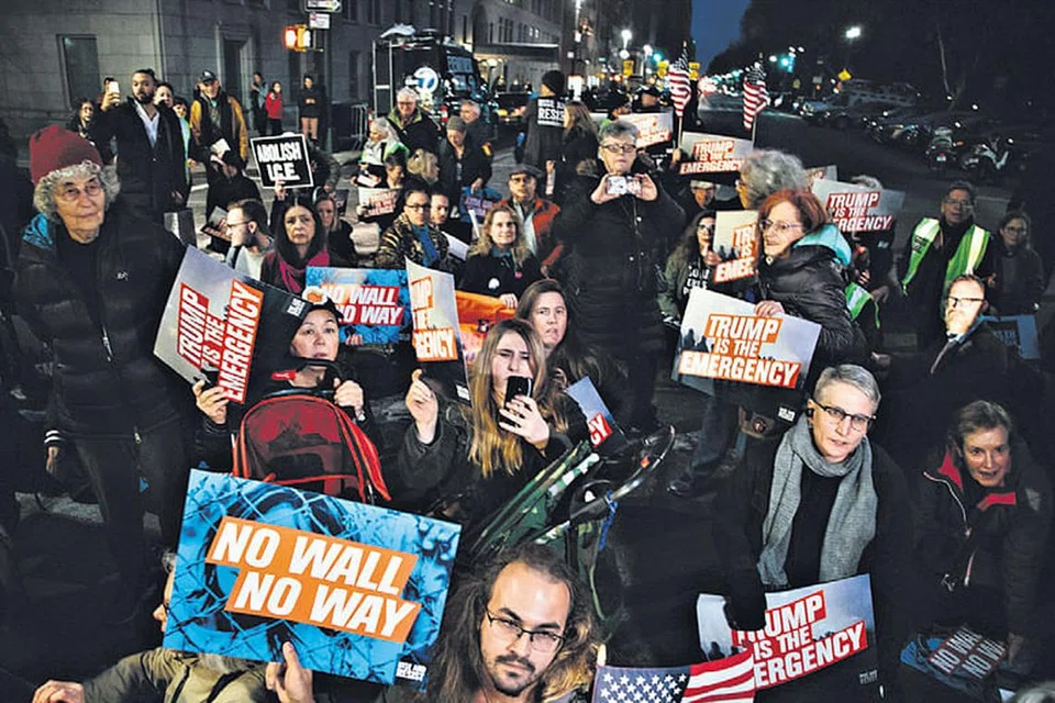 அதிபர் டிரம்ப் அவசரநிலை பிரகடனப்படுத்த இருப்பதை அறிவித்ததைத் தொடர்ந்து நியூயார்க்கின் மேன்ஹெட்டனில் உள்ள டிரம்ப் அனைத்துலக ஹோட்டல் வெளியே மக்கள் தங்கள் கண்டனத்தைத் தெரிவிக்க ஆர்ப்பாட்டம் நடத்தினர். படம்: இபிஏ -