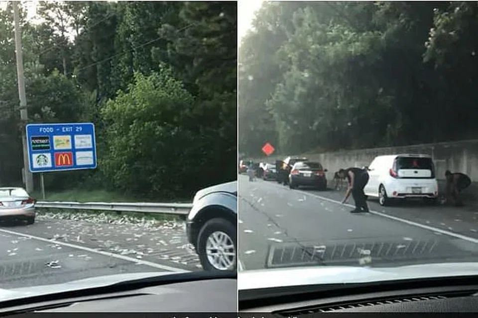 நெடுஞ்சாலை வழியாக ரொக்க நோட்டுக் கட்டுகளைக் கொண்டு சென்ற லாரியின் கதவுகள் எதிர்பாராதவிதமாகத் திறந்துகொண்டதைத் தொடர்ந்து நோட்டுக்கட்டுகள் அந்தச் சாலையில் சிதறின. அதனைக் கண்ட வாகனமோட்டிகள் பலர் உடனே தங்கள் கார்களை ஒரு பக்கமாக நிறுத்திவிட்டு பண நோட்டுகளை முடிந்தவரை அள்ளிச்செல்வதைக் காட்டும் ஒரு காணொளி தற்போது சமூக ஊடகங்களில் பரவி வருகிறது.