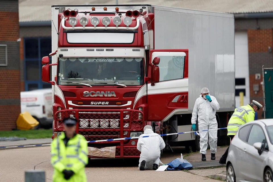 38 பெரியவர்களும் பதின்ம வயதில் இருக்கும் ஒருவரும் மத்திய லண்டனிலிருந்து 40 கிலோமீட்டர் தூரத்திலுள்ள எசெக்ஸ் பகுதியிலுள்ள தொழிற்பேட்டை ஒன்றில் சடலங்களாகக் கண்டுபிடிக்கப்பட்டனர். அந்தக் குளிர்பதன லாரியில் அடைக்கப்பட்டிருந்த அவர்கள் அனைவரும் மூச்சுத்திணறி இறந்ததாகக் கூறப்படுகிறது. அவர்கள் அனைவரும் சீனாவைச் சேர்ந்தவர்கள் என்ற தகவலும் வெளியாகியுள்ளது.