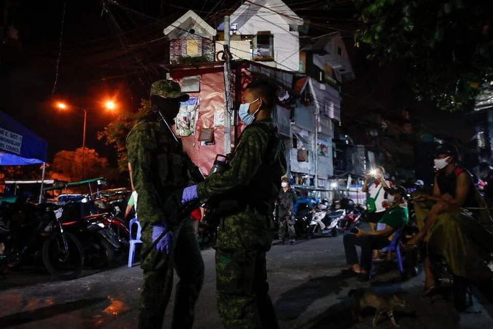 பிலிப்பீன்ஸ் நாட்டில் கொவிட்-19 ஊரடங்கு விதிக்கப்பட்டுள்ள நிலையில் தலைநகர் மணிலாவின் புறநகர்ப்பு பகுதியில் காவல்துறையினர் துப்பாக்கி ஏந்தியவாறு சுற்றுக்காவல் பணியில் ஈடுபட்டுள்ளனர். படம்: ஏஎப்பி -