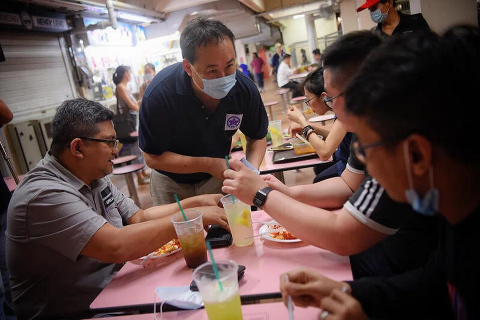ஜாலான் புசார் குழுத் தொகுதியில் போட்டியிடும் மக்கள் குரல் கட்சி வேட்பாளரும் கட்சியின் தலைமைச் செயலாளருமான திரு லிம் தியன் பீச் ரோடு ஆர்மி மார்க்கெட்டில் குடியிருப்பாளர்களுடன் உரையாடி வாக்குகள் சேகரித்தார். படம்: ஸ்ட்ரெய்ட்ஸ் டைம்ஸ் -