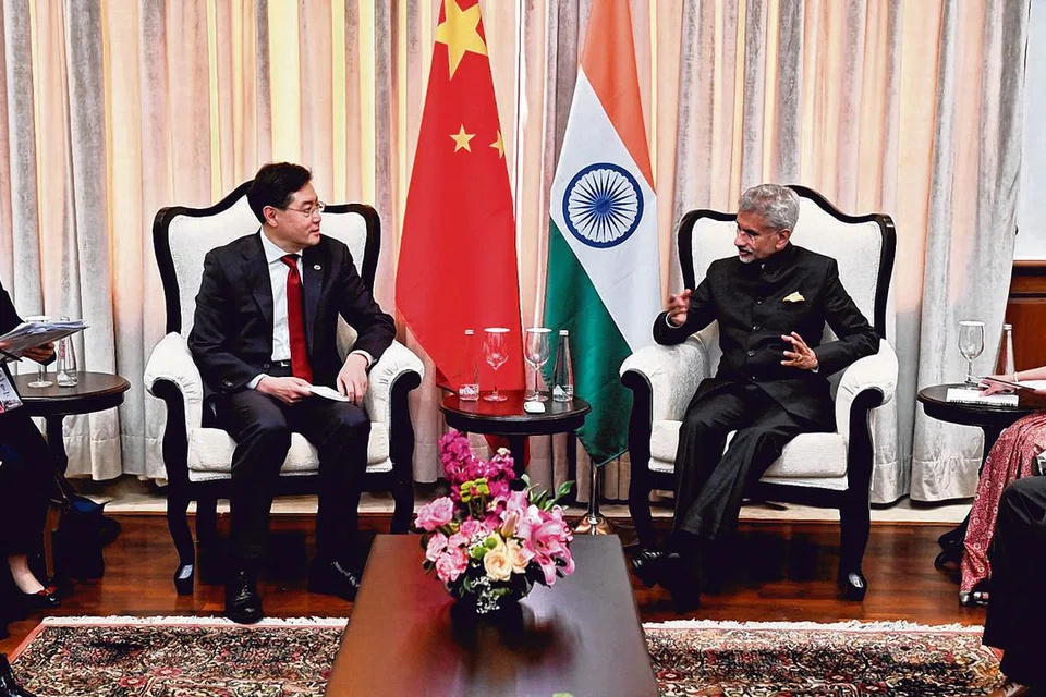 இந்தியாவில் நடைபெறும் 'ஜி20' மாநாட்டையொட்டி இந்திய வெளியுறவு அமைச்சர் ஜெய்சங்கரும் (வலம்) சீன வெளியுறவு அமைச்சர் சின் கேங்கும் இரு தரப்பு சவால்கள் குறித்து நேற்று பேசியுள்ளனர். படம்: ராய்ட்டர்ஸ்