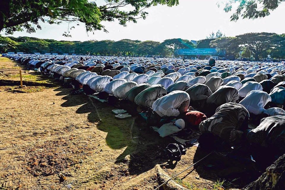உலகில் ஆக அதிக எண்ணிக்கையில் முஸ்லிம் மக்களைக் கொண்டுள்ள இந்தோனீசியாவின் அச்சே மாநிலத்தில் தலைநகர் பண்டா அச்சேயில் நோன்புப் பெருநாளையொட்டி நேற்று காலை வழிபாட்டில் ஈடுபட்ட மக்கள். இந்தோனீசியா, மலேசியா உள்ளிட்ட நாடுகளில் கிட்டத்தட்ட மூன்று ஆண்டுகளுக்குப் பிறகு கொவிட்-19 கட்டுப்பாடுகளின்றி நோன்புப் பெருநாள் கொண்டாடப்பட்டது. கிருமிப் பரவல் குறித்த அச்சமும் மக்களிடையே குறைந்துள்ளது.