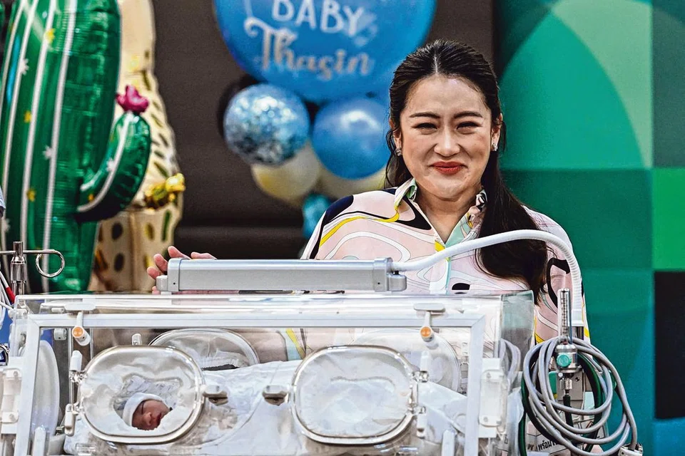 புதிதாகப் பிறந்த தமது ஆண் குழந்தையைச் செய்தியாளர்களிடம் காட்டும் திருவாட்டி பேடோங்டார்ன் ஷினவத்ரா. படம்: ஏஎஃப்பி