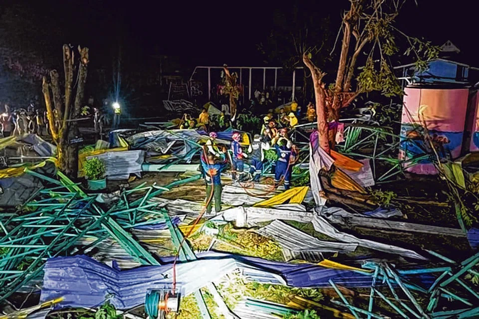 மூன்று பக்கம் சுவர்களும் மேற்கூரையும் கொண்டிருந்த கட்டடம் (படம்) புயல் காற்றால் முற்றிலும் இடிந்து விழுந்ததாக அதிகாரிகள் கூறினர். உயிரிழந்த சிறுவர்கள் ஆறு வயதுக்கும் 13 வயதுக்கும் இடைப்பட்டவர்கள். சம்பவத்தின்போது அச்சிறுவர்கள் பார்வையாளர்கள் முன்னிலையில் அவ்விடத்தில் விளையாடிக்கொண்டிருந்ததாகத் தெரிகிறது. உள்ளூர் நேரப்படி மாலை 6.30 மணியளவில் புயல் வீசியதாகவும் அதைத் தொடர்ந்து கனமழை பெய்ததுடன் பலத்த காற்றும் வீசியதால் கூரை திடீரென்று இடிந்து விழுந்ததாகவும் கூறப்பட்டது. உயிரிழந்த மற்ற மூவரில் இருவர் பெற்றோர். ஒருவர் அக்கட்டடத்தின் பராமரிப்பாளர். சம்பவத்தில் மேலும் 18 பேர் காயமடைந்தனர். அவர்கள் இரு மருத்துவமனைகளில் சிகிச்சை பெற்றுவருகின்றனர். அவர்களின் உடல்நிலை சீராக இருப்பதாகக் கூறப்பட்டது. புயலால் சாம் நாம் மாவட்டத்தில் சில வீடுகள் சேதமுற்றதாகக் காவல்துறை கூறியது. தாய்லாந்தில் பருவமழைக் காலம் தொடங்கியுள்ள நிலையில் நாட்டின் பெரும்பாலான இடங்களில் அடுத்த சில நாள்களில் கனமழை பெய்யும் என முன்னுரைக்கப்பட்டுள்ளது.