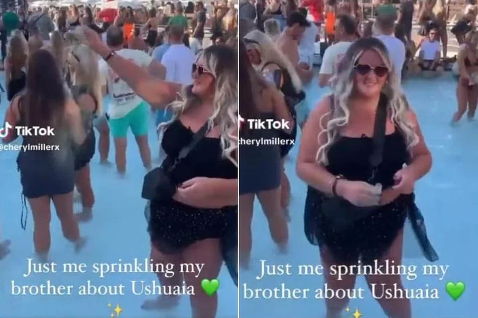 இச்சம்பவம் ஸ்பெயினின் இபிஸா நகரில் நிகழ்ந்தது. கூட்டமாக இருந்த நீச்சல் குளத்தில் அப்பெண் சகோதரரின் சாம்பலைத் தூவிய காட்சி காணொளியில் பதிவு செய்யப்பட்டது.