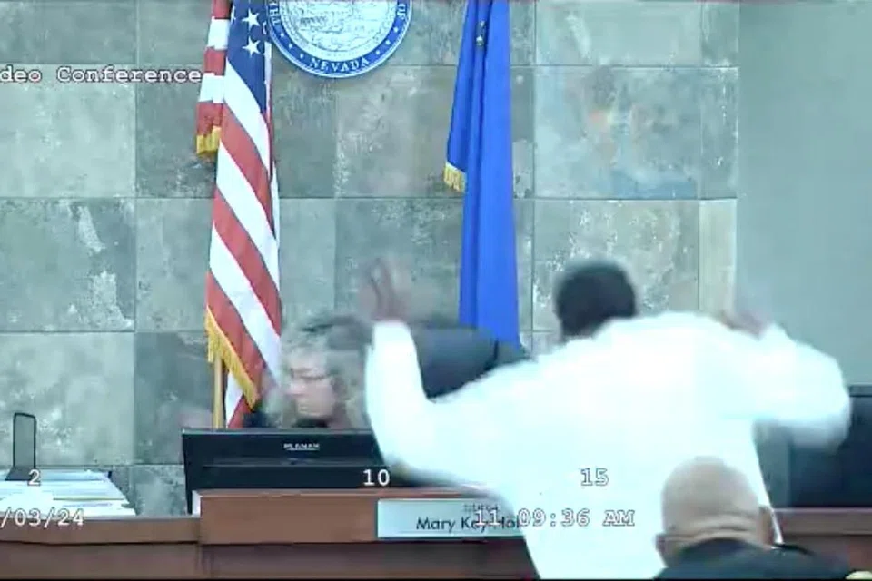 அச்சம்பவம் சென்ற மாதம் மூன்றாம் தேதியன்று கிளார்க் கெளன்டி மாவட்ட நீதிமன்றத்தில் நிகழ்ந்தது. பிறரைத் தாக்க முயன்றதற்காக தனக்கு சிறைத் தண்டனை விதிக்கப்படக்கூடும் என்று நீதிபதி மேரி கே ஹோல்தஸ் தெளிவாகக் கூறியபோது 30 வயது டியோப்ரா ரெடன் அவர் மீது தாவிக் குதித்தார்.