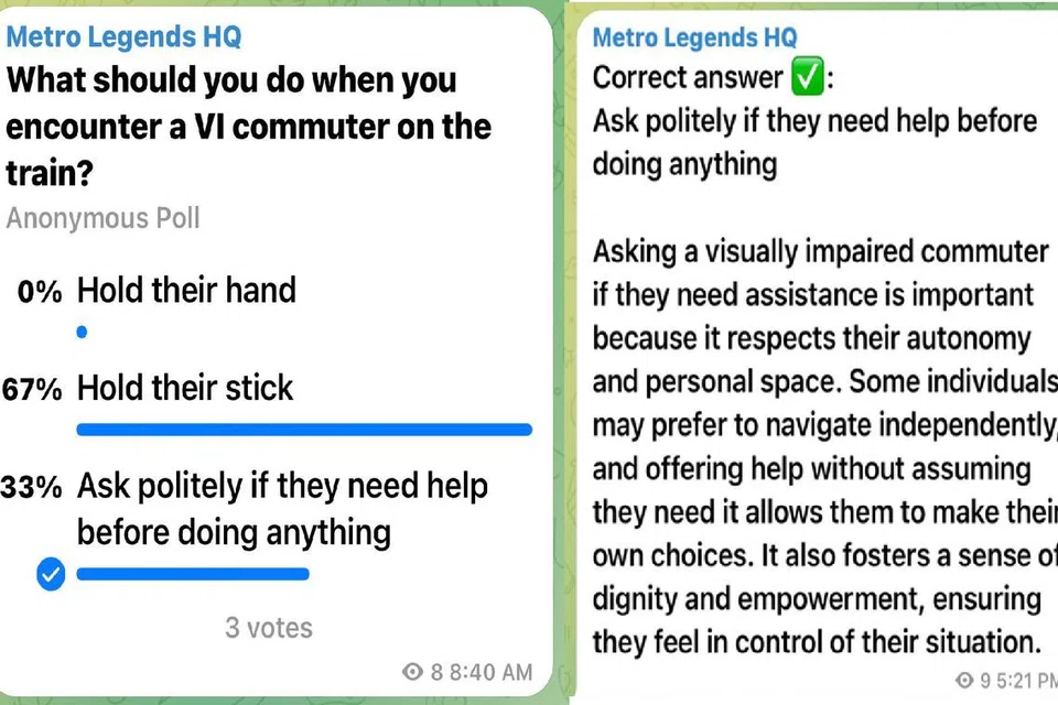 ஏதேனும் கேள்விகள் இருந்தால் சிங்கப்பூர் பார்வைக் குறைபாடுள்ளோர் சங்கத்திடம் அந்தச் சேனல்வழி கேட்டுத் தெரிந்துகொள்ளலாம்.