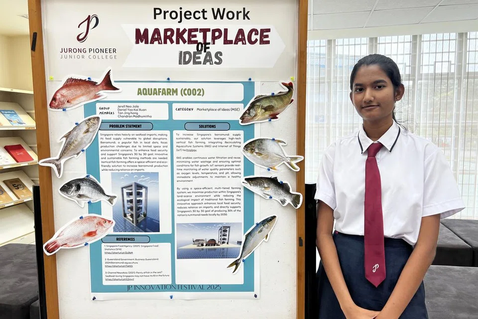 சிங்கப்பூரின் தெற்குக் கரையோரத்தில் ஒன்பது மாடி மீன் பண்ணையை உருவாக்கலாம் என்கிறார் ஜூரோங் பைனியர் தொடக்கக் கல்லூரியைச் சேர்ந்த சந்திரன் மதுமிதா, 18.