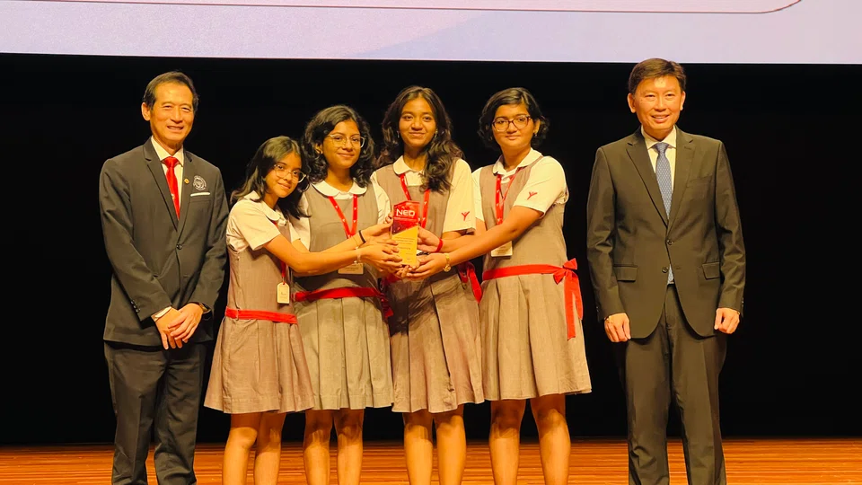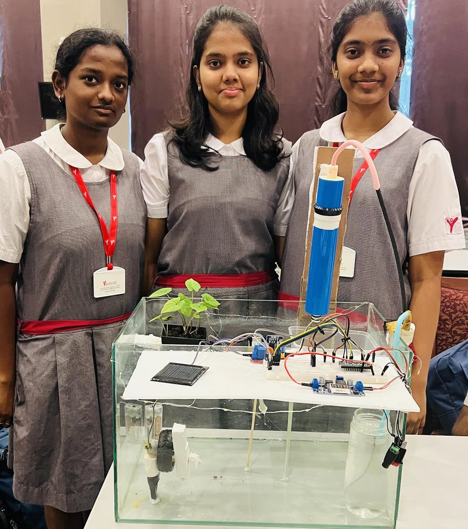 உயர்நிலைப் பிரிவில் முதல் பரிசான $3,000 காசோலையை வென்ற யுவபாரதி அனைத்துலகப் பள்ளி மாணவிகள் உணவு, காய்கறிக் கழிவுகளிலிருந்து மின்சாரத்தையும் உரத்தையும் தயாரித்தனர்.