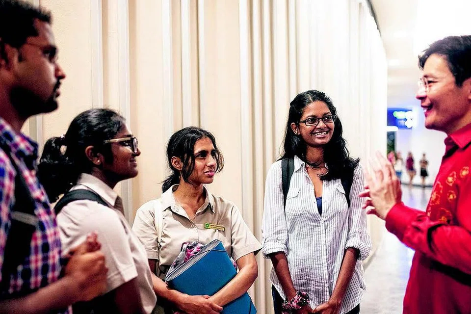 கலந்துரையாடலில் பங்கேற்ற மாணவர்கள் (இடமிருந்து) திலீப் குமார், ஆர்.பிரசாந்தி, கன்னா அனீஷா மோனிஷ், நந்தினி ஆகியோருடன் தேசிய வளர்ச்சி அமைச்சர் லாரன்ஸ் வோங் (வலக்கோடி) உரையாடினார். படம்: தேசிய வளர்ச்சி அமைச்சு