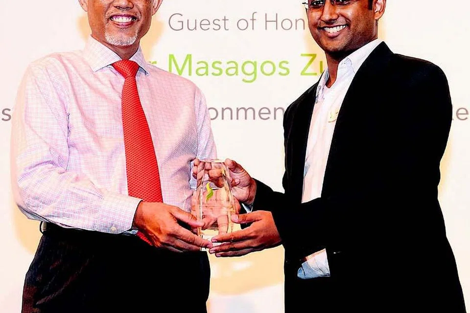 சுற்றுப்புறத்தைப் பாதுகாக்க வித்தியாசமான முயற்சியில் இறங்கிய வீரப்பன் சுவாமிநாதனுக்கு 'சுற்றுச் சூழல் நண்பன்' எனும் விருதை சுற்றுப்புற, நீர்வள அமைச்சர் மசகோஸ் ஸுல்கிஃப்லி (இடது) வழங்கினார். படம்: தேசிய சுற்றுப்புற வாரியம், ஸ்ட்ரெய்ட்ஸ் டைம்ஸ்
