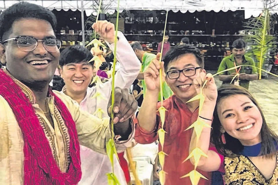 சில ஆண்டுகளுக்கு முன் செங் ஹுவா தொகுதியில் பொங்கல் கொண்டாட்ட அலங்காரங்களைச் செய்த பல இன தொண்டூழியர்களுடன் ஜெகதீஷ்வரன் ராஜு.