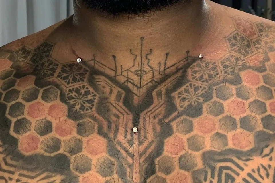 ஆண்களுக்கு முடி திருத்துபவராக இருக்கும் சிவகுரு ராஜா கண்ணு, 30, தொடக்கத்தில் பச்சை குத்துவதில் நாட்டம் வைத்ததில்லை. ஆனால் பிறகு அவருக்கு ஆர்வம் ஏற்பட்டது. இன்று அவர் ஒரே ஒரு வடிவத்தை மட்டும் தனது உடல் முழுவதும் பச்சை குத்தியுள்ளார்.
